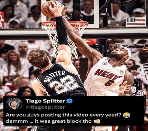 好在13-14賽季,斯普利特跟隨馬刺實現了復仇,并在總決賽G1也蓋了一個詹姆斯帽,以4-1擊敗熱火奪得了NBA總冠軍,而他也成為首個奪得NBA總冠軍的巴西球員。