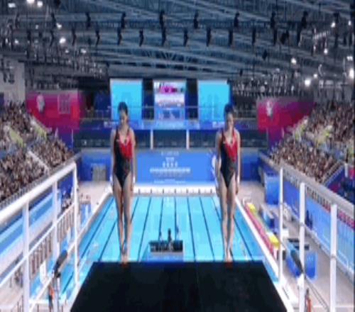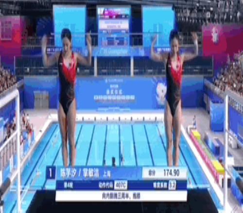 第三跳107b動作上,陳芋汐和掌敏潔仍然保持著同步率驚人的出色發揮,以174.9分領先第二名近10分繼續領跑。